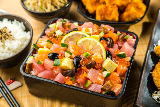 將新鮮時蔬、煎蛋與鮭魚、鮪魚等生餘切丁,拌成一碗飯,淋上檸檬汁,酸甜滋味口感更提升,大扒幾口咀嚼,滿足感難以形容!