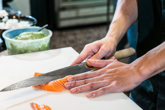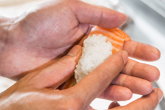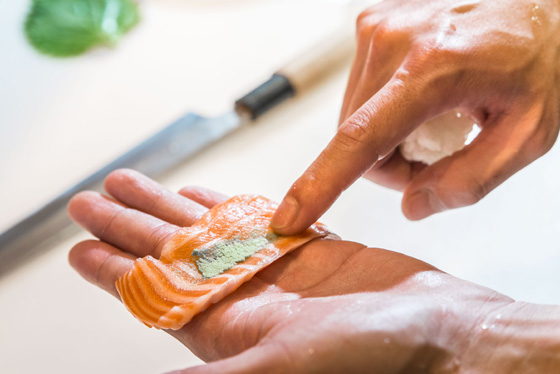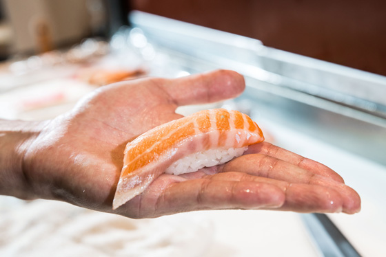台上一分鐘,台下十年工。瞧瞧師傅精湛的廚藝、下刀俐落,在外行我們看這只是普通的幾刀,對專業級來說,每吋肉切下的厚薄、壽司的飯量等等,都影響著顧客品嚐的美味程度。